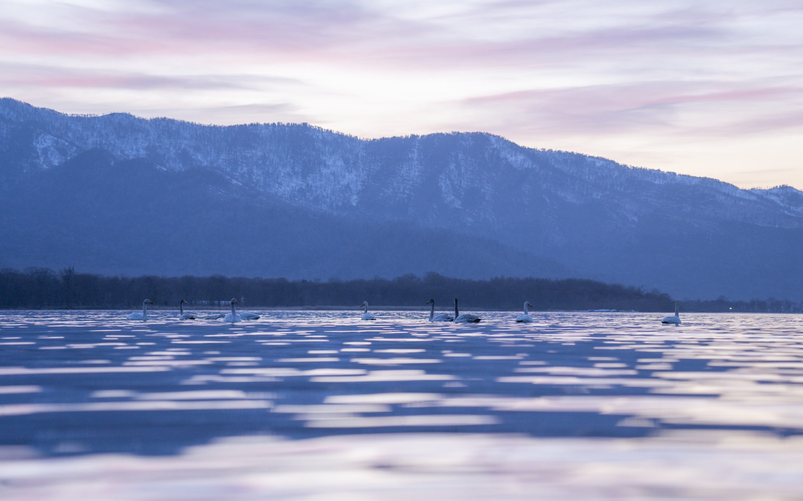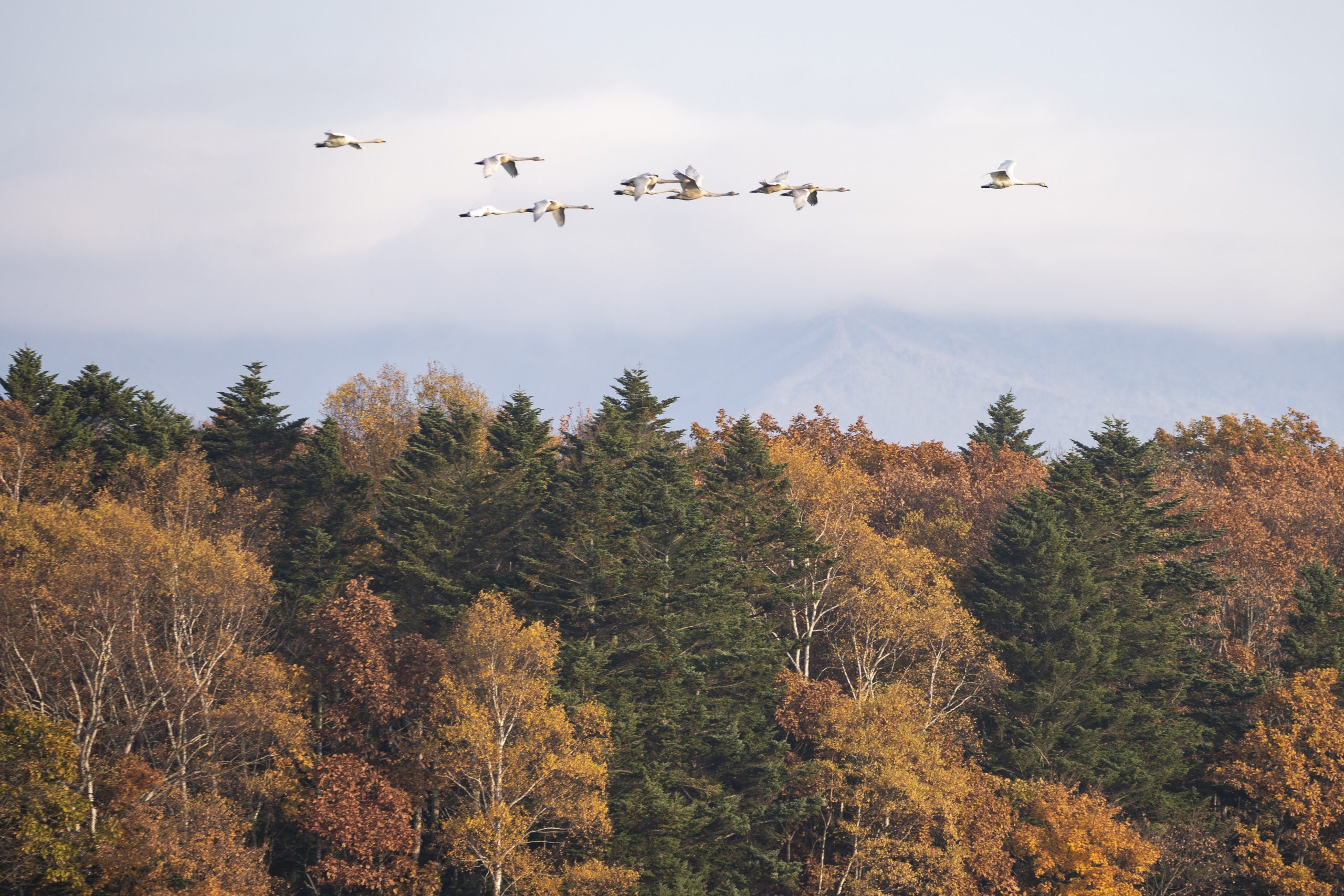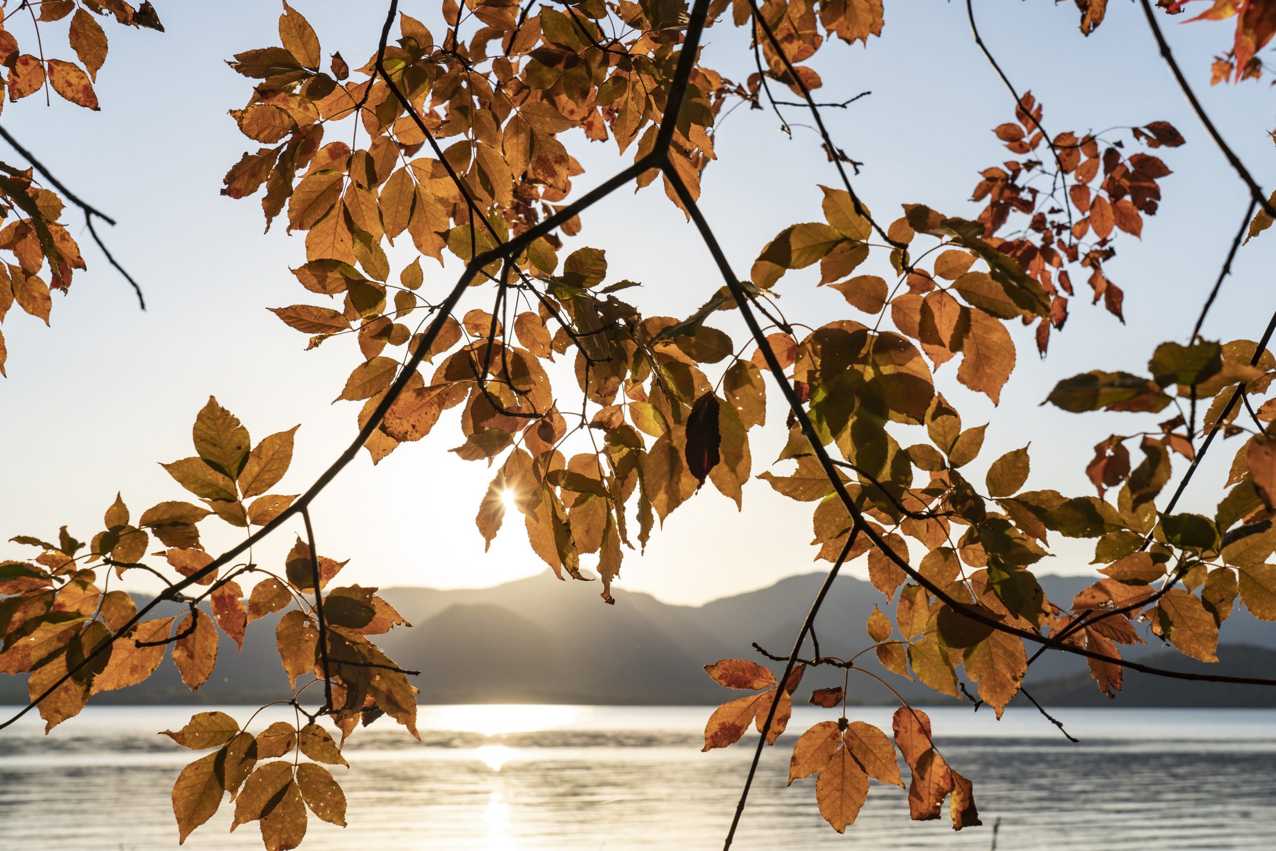 お盆を過ぎれば、もう秋。徐々に朝晩の冷え込みが強くなってきます。春と同様に寒暖差が激しいのがこの時期です。植物も動物たちも長い冬に向けて準備を始める季節。標高の高い場所から徐々に色づき始め、湖畔沿いが紅葉のピークを迎えるのは例年10月下旬頃。11月上旬、カエデなど広葉樹の葉がほぼ全て大地に落ちる頃、カラマツが黄金色に色づき、紅葉シーズンのフィナーレを飾ります。遥かシベリアからは越冬のためオオハクチョウたちが飛来。野山からは繁殖期を迎えた雄鹿の声が響きわたります。冬に向かって早足のドラマチックな季節です。