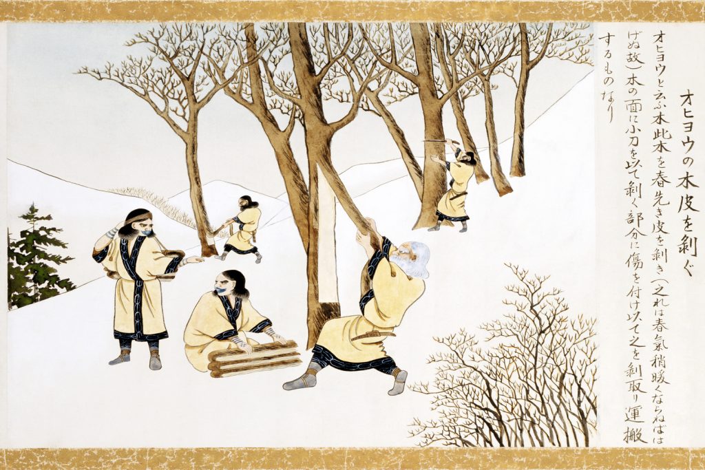 アイヌの世界観を表す際に特徴としてあげられるのは、このシリーズのテーマにもなっている「カムイ」との関係性です。動物もそうですが、樹木たちもカムイの国では人間と同じような姿、同じような生活を送っていると信じていました。容姿が美しく、アイヌの役に立つ樹木に対しては、 “素性(精神)が良い” という表現をします。木の幹は胴体、枝は手、根は足という言い方になります。木の皮は、木が着ている着物です。樹皮を剥がさせてもらうときは、「着物をお借りします」と言いながら、でも全裸にしないように一部を残し、残った一部の着物が風に飛ばされないよう木の帯を巻くといった丁寧さで扱います。アイヌにとっては丁寧というより、当たり前の行動なのでしょうが。