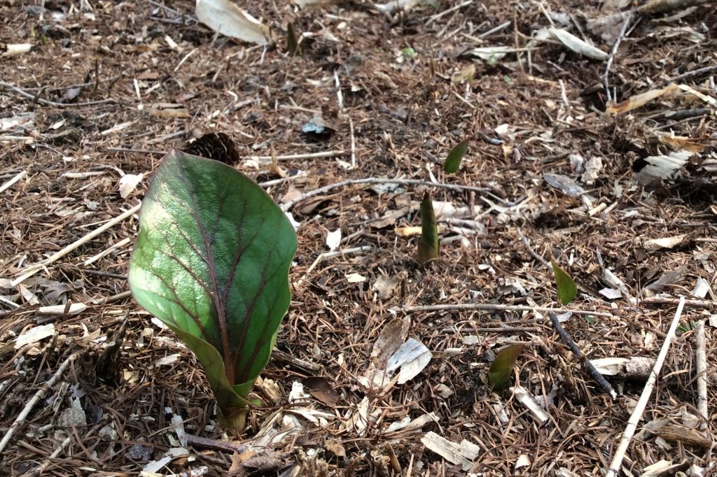 オオウバユリの芽吹きは、厚くツヤツヤで赤い葉脈の葉っぱが特徴。また出会えるかな。