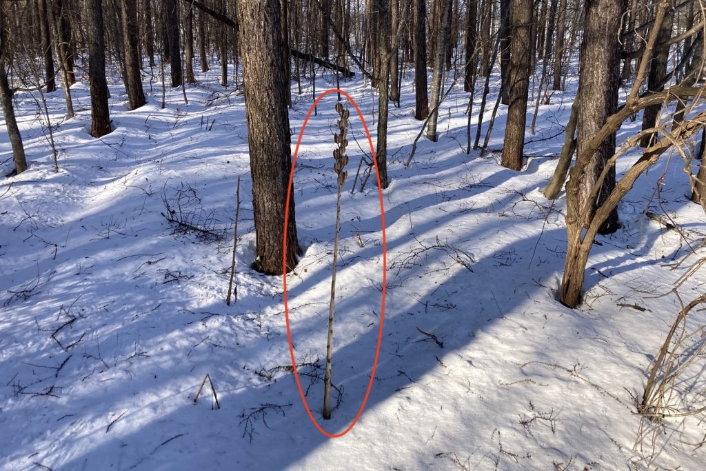 前編では四季の様子をお伝えしましたが、オオウバユリは秋に立ち枯れた後でも、雪の中からピョコッと頭を出しているのを見かけます。オオウバユリのことを知らないと、なかなか目に入ってこないかもしれませんが、冬でもぜひ探していただきたい姿です。意外とあります!