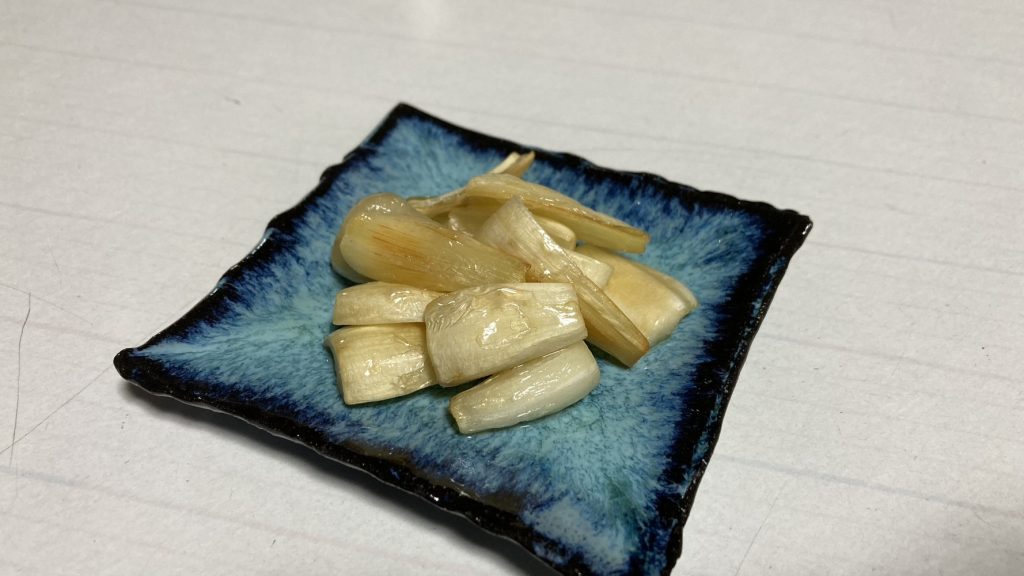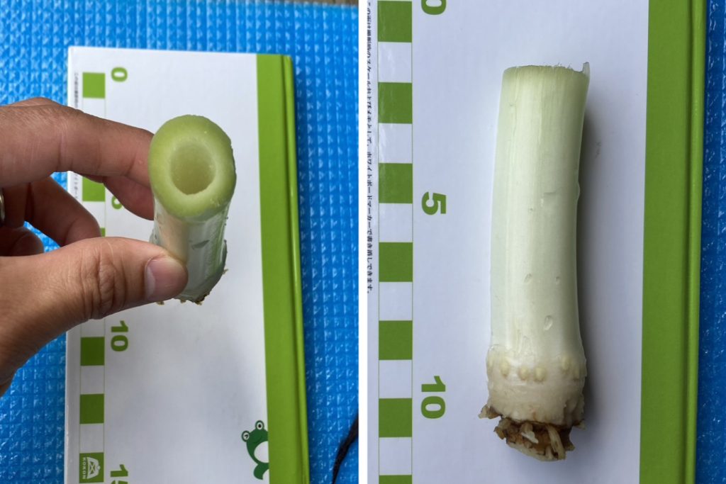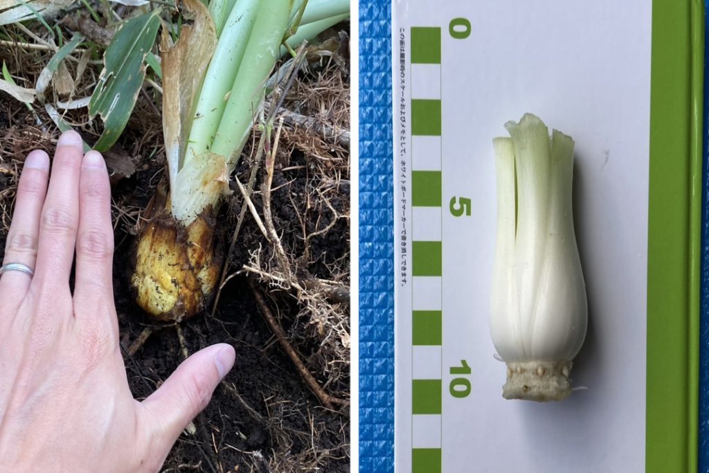 一方、本来であれば採らないはずの、花が咲く株の鱗茎はというと、掘ってみると膨らみや鱗状のものがなく、真っ直ぐ伸びて中は空洞になっていました。花を咲かせるために鱗茎の栄養を使い切っているので、食べられる部分はもはや無いのだなと勝手に納得したわけです。