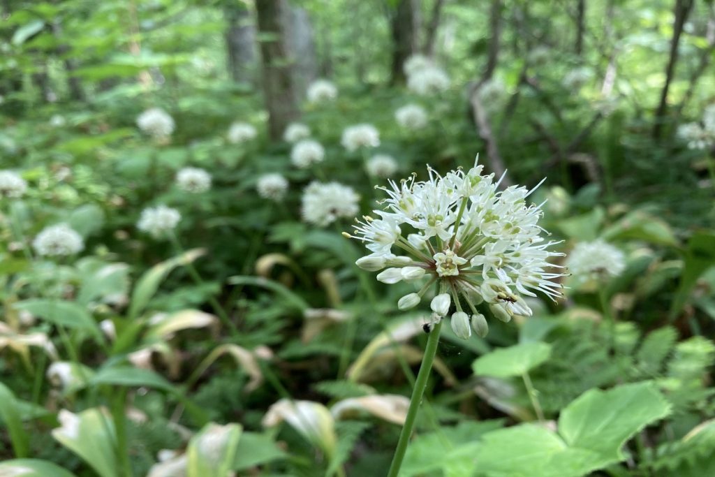 MKT沿いでも見かけるギョウジャニンニクは華奢で、山菜として味わうのには物足りない……どうかそのままに。写真は、秘密の場所で見つけたお花畑。