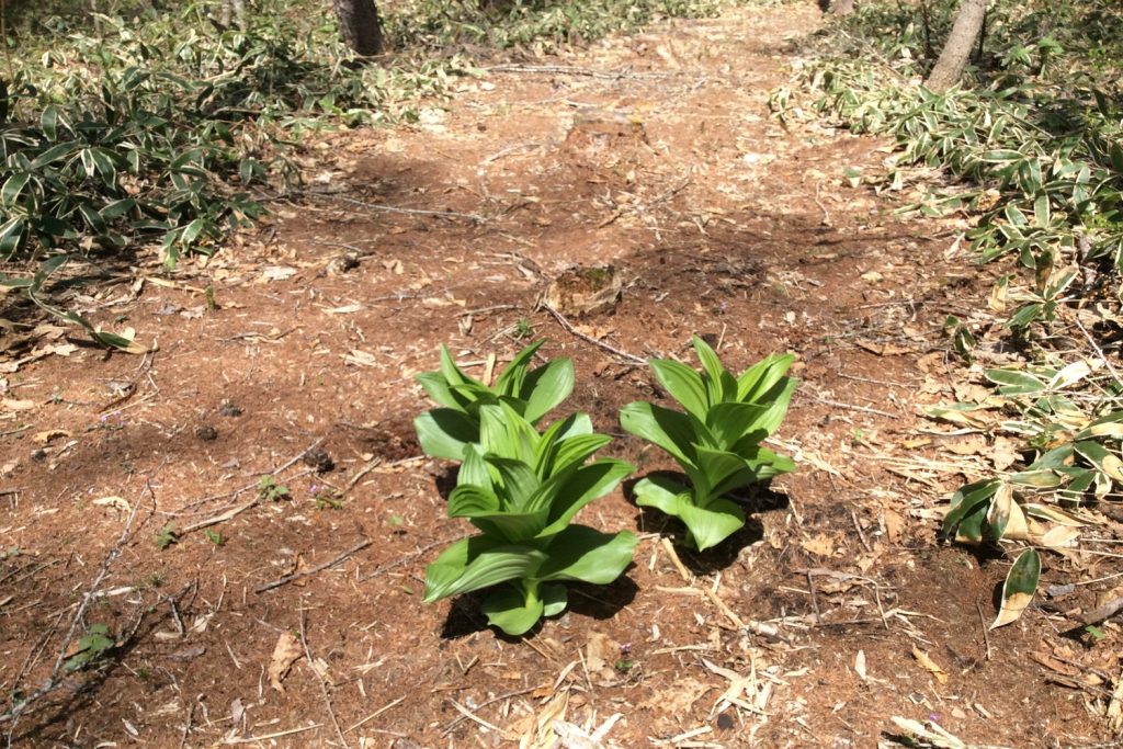 数年前、自宅周辺のカラマツ林に散歩道を作るためにササ刈りをしたところ、日当たりがよくなったせいか、刈り払った道を塞いでしまうほどにオオウバユリやバイケイソウが次々と葉を出し始めた!ということがあったのです。