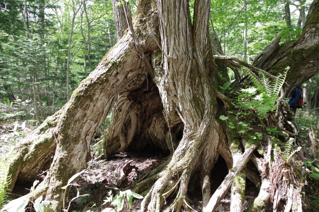 ホテルの前を通過して、津別峠へ上る道を左手に見た後に一条橋を越えたら、国道脇(屈斜路湖側)の森へ入ります。ここからはカツラやシナ、エゾマツなどの巨木が残る森が続き、小さな沢を3本渡ると屈斜路湖の北側へ向かう屈斜路湖畔林道に出ます。林道を30mほど歩いたら左手の森へ入り、林道と並行するように森の中を進みます。4本の沢を渡るとやがて美幌峠旧道入口に出ます。
