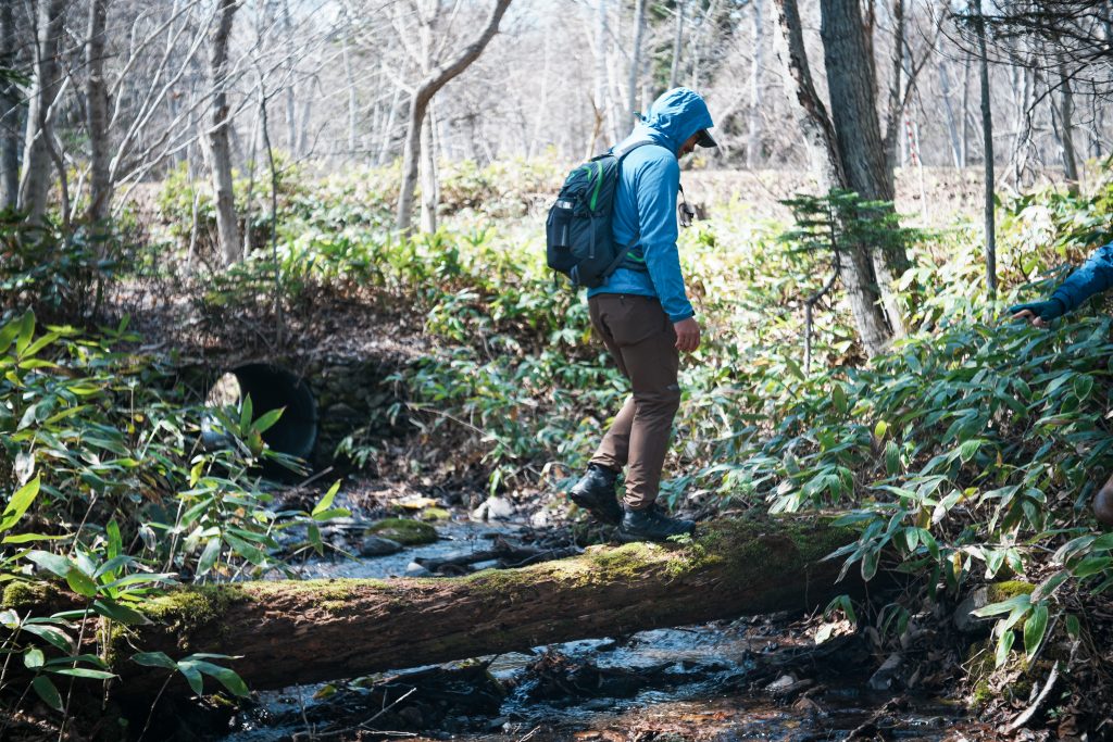 林道内を2km弱歩いた後、舗装道を左折して、踏切を越えたら右側に現れる階段を下りて、かつてアトサヌプリで採掘した硫黄の運搬用に敷設された旧釧路鉄道の廃線跡の森へ。約1.2kmの森を抜けたら、国道391号に合流します。国道の歩道を約1km進み、右折して町道へ入り、左手奥にアトサヌプリを眺めながらJR川湯温泉駅に向かいます。