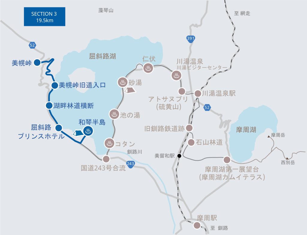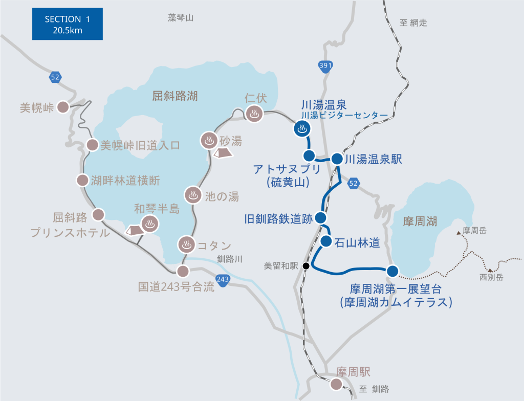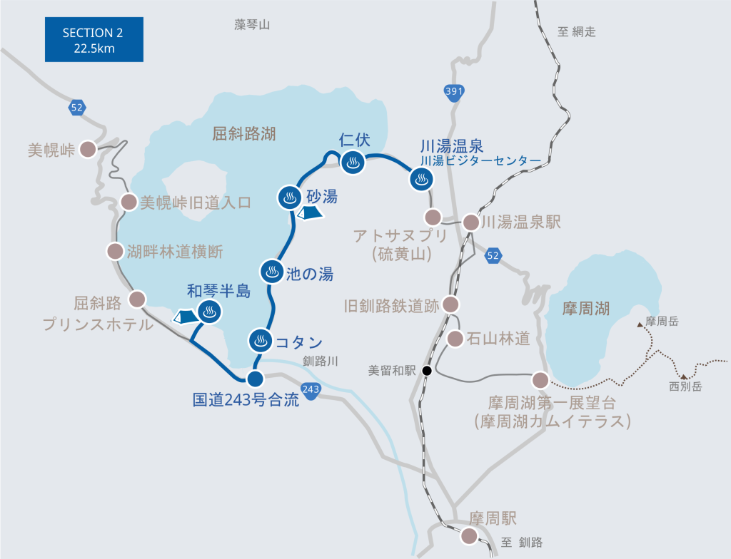 セクション2(湖の道)は、日本最大のカルデラ湖である屈斜路湖の湖畔を歩く道です。川湯温泉街から屈斜路湖へ。このセクションには数多くの温泉が湧出しています。また、湖畔の豊かな森の中を歩く散策路も魅力です。