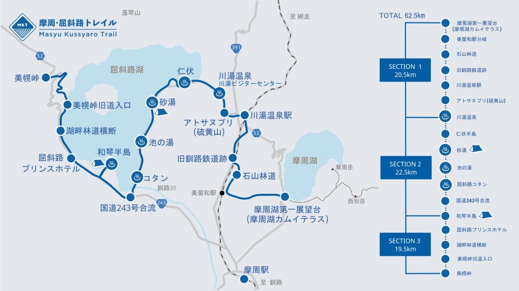 摩周湖第一展望台〜美幌峠までの62.5 kmは、「火山の道」「湖の道」「森の道」という3つのセクションで構成されています。スルーハイク(一度に歩ききること)もおすすめですが、自分の体力や都合に合わせて、いずれかのセクションだけを歩いても十分楽しんでいただけます。
