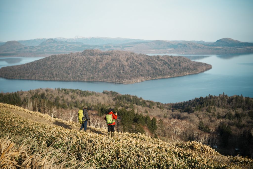 少し視界が開けてくると、美幌峠まではあと少し。眼下に屈斜路湖の姿を見ることもできます。国道243号に合流したら、車に十分注意をしながら横断し、旧道の続きであるササ原を美幌峠まで一気に登ります。 美幌峠展望台からは、日本最大の屈斜路カルデラと、その半分を占める屈斜路湖、遠くにはMKTの東の起点である摩周湖展望台から見えた摩周岳と、これまで歩いてきたMKTの道のりを一望することができます。